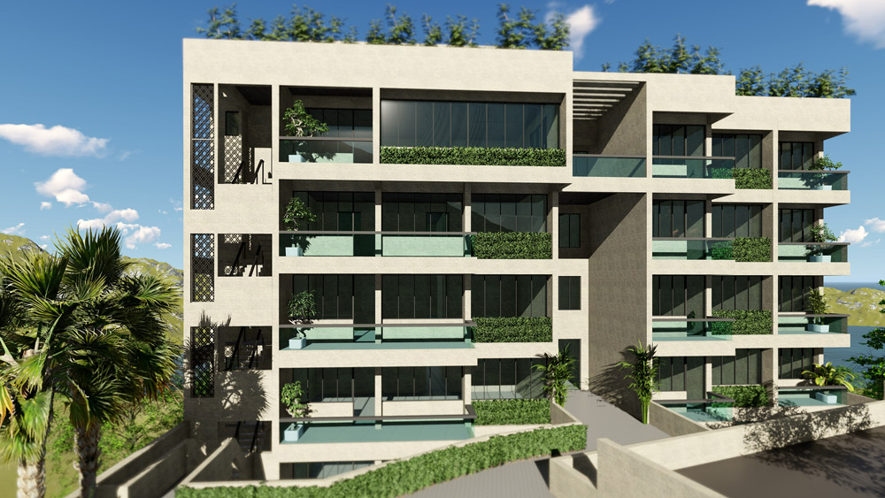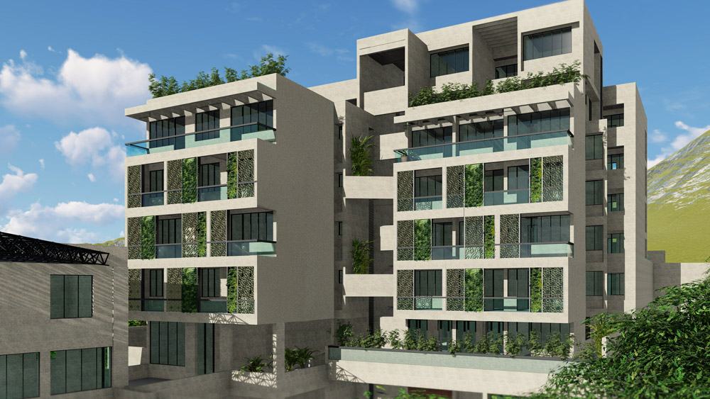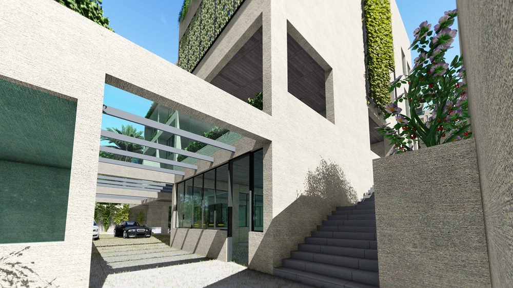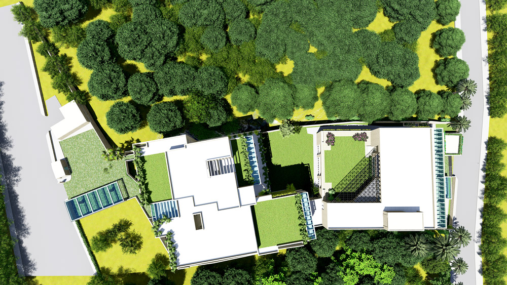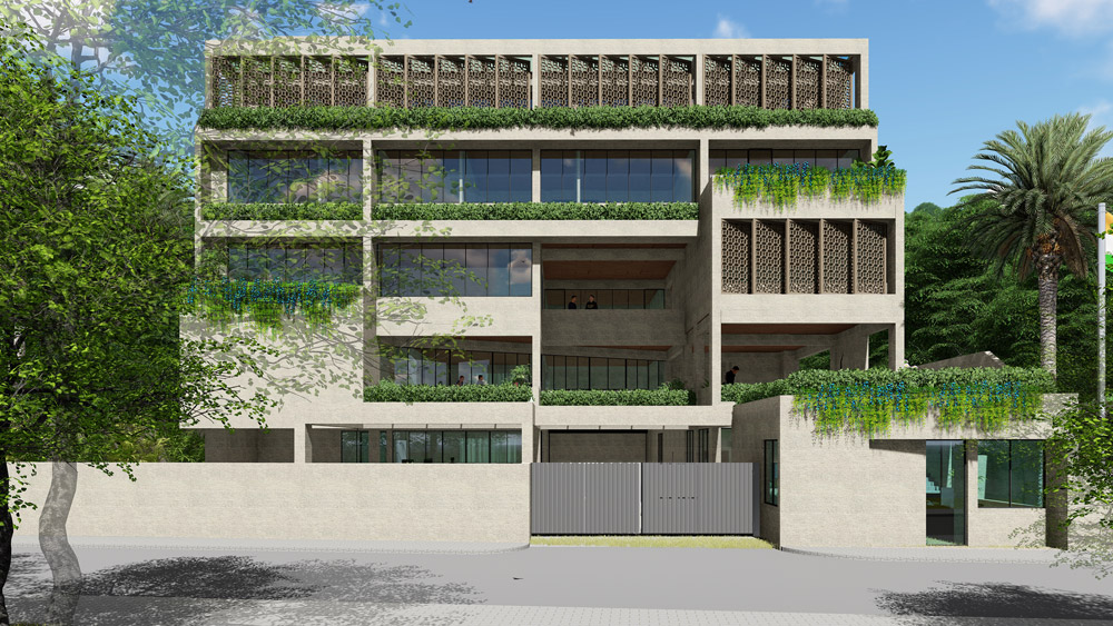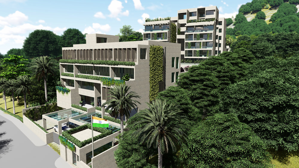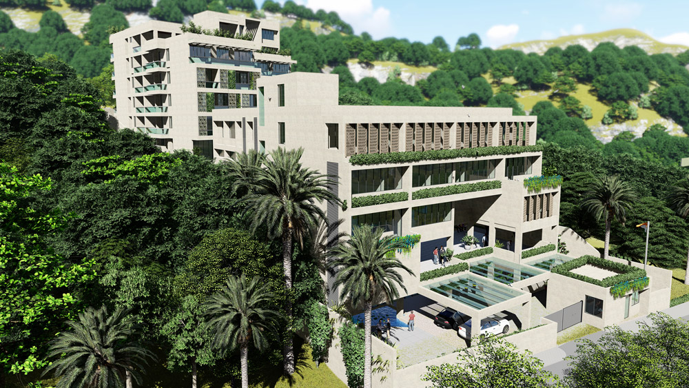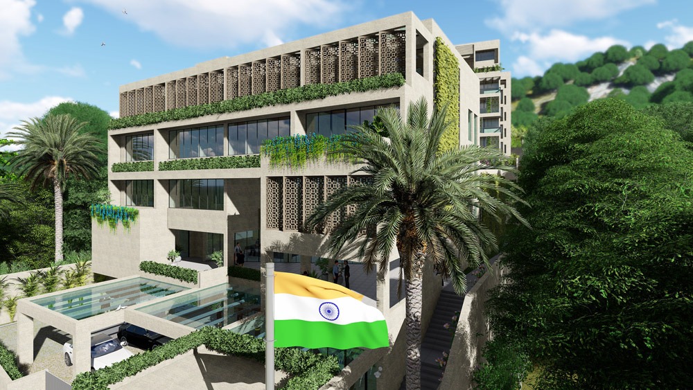 The design was selected in an international architectural design competition organised by the High Commission of India in Seychelles. The High Commission is located in a prestigious precinct of Victoria, Mahe. The design of the Indian High Commission therefore puts forth country’s distinct identity as a vibrant, technologically equipped and economically strong modern country. The design was also a challenge since the site is steeply sloping, with a 20m level (almost 6 stories) difference between the front & rear roads.The chancery and cultural centre building has been located towards the front. Segregation of functions has been level-wise – the chancery offices are planned at the upper two levels, whereas visa and cultural centre activities are located at lower levels. Access to the residential building has planned from the rear road, and the residences steer clear of the roof of chancery so as to provide uninterrupted views of the ocean beyond.